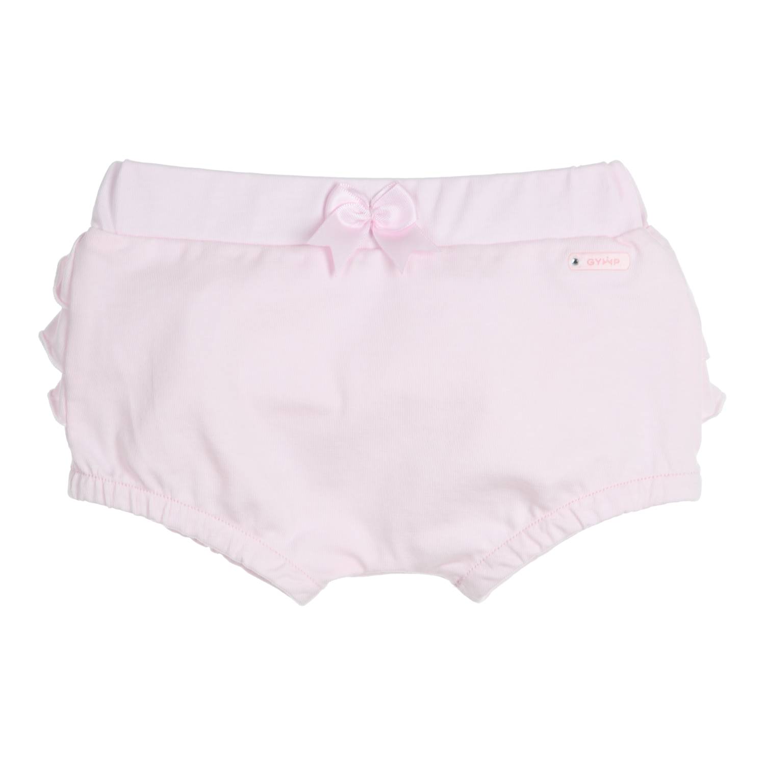 Bloomer lichtroze van katoenen tricot met ruffels over de achterzijde.