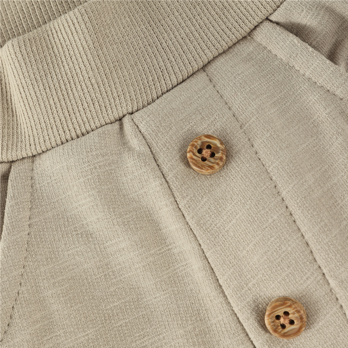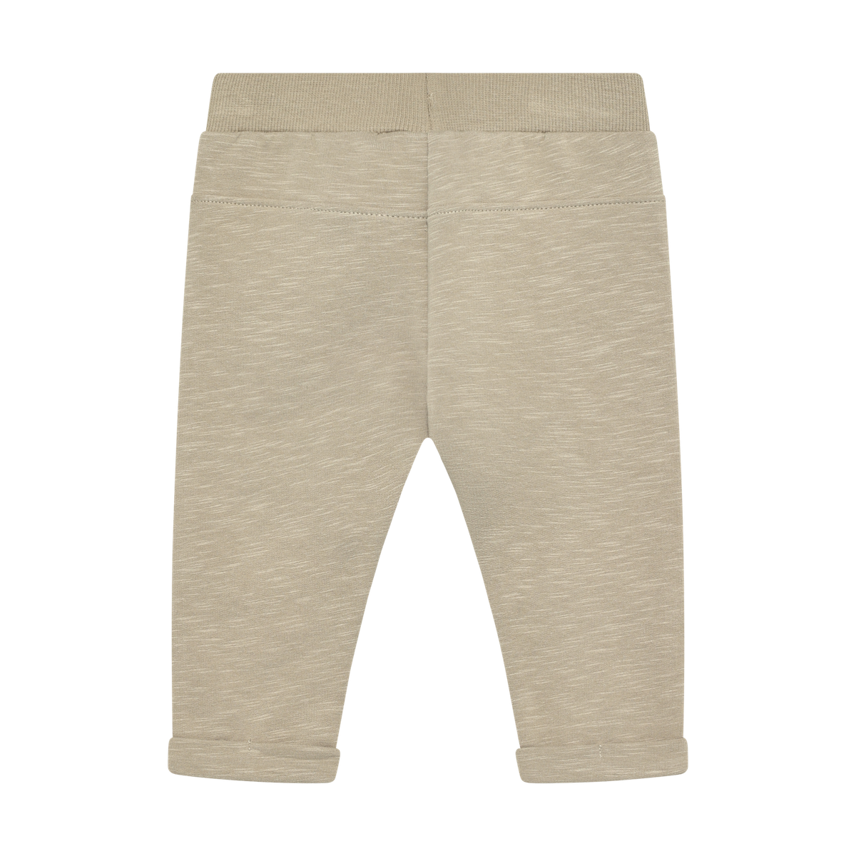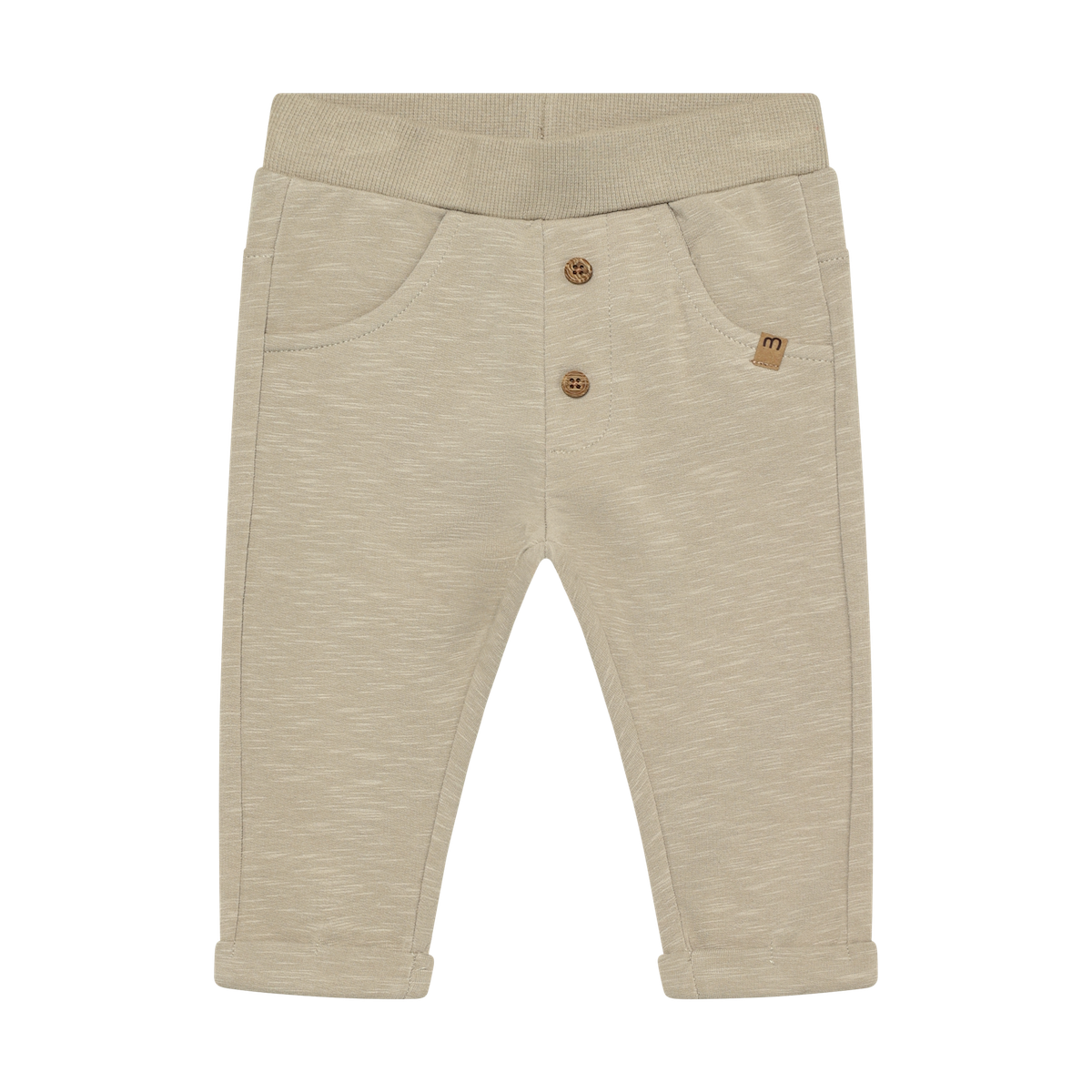 Sweatstof broekje in het beige met twee kleine steekzakjes. Voorkant centraal afgewerkt met twee knoopjes en pijpjes zijn enkel omgeslagen. Stofsamenstelling biologisch katoen(95%) en elastaan(5%). Comfortabel en goed draag- en wasbaar. (GOTS = Global Organic Textile Standard)