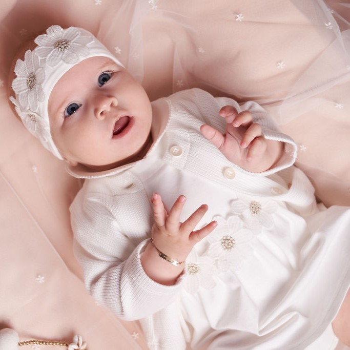 Haarbandje in het off-white met bloemen op de voorkant. Stofsamenstelling biologisch katoen(93%) en elastaan(7%). Comfortabel en goed draagbaar.