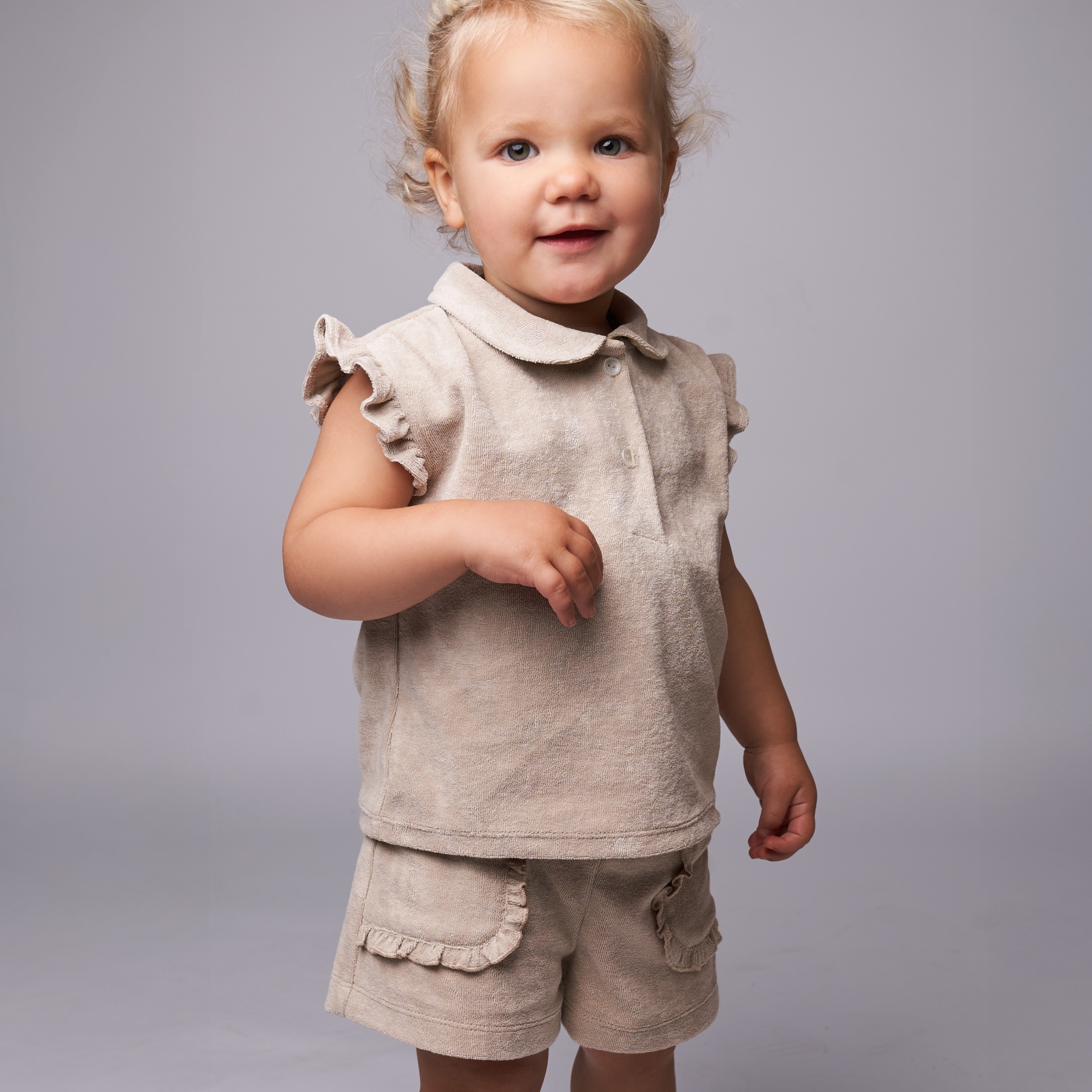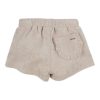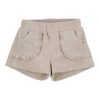 Short van badstof in het beige, kleine steekzakjes aan de voorkant en een achterzakje met een ruffelafwerking. Stofsamenstelling katoen(80%) en polyester(20%). Comfortabel en goed draag- en wasbaar.
