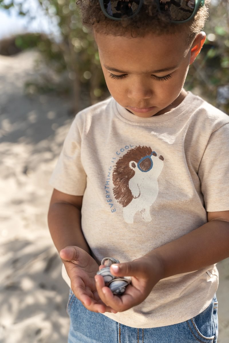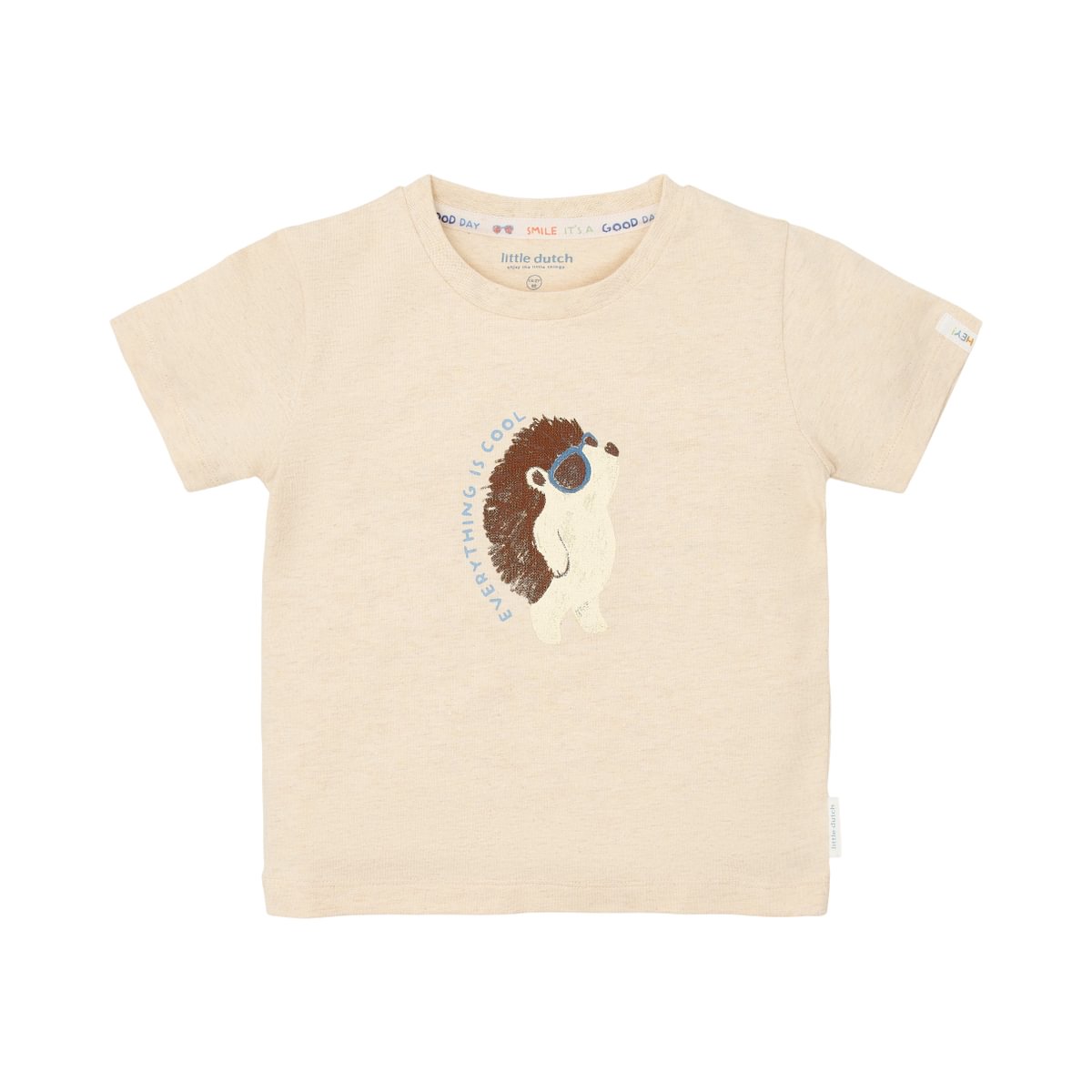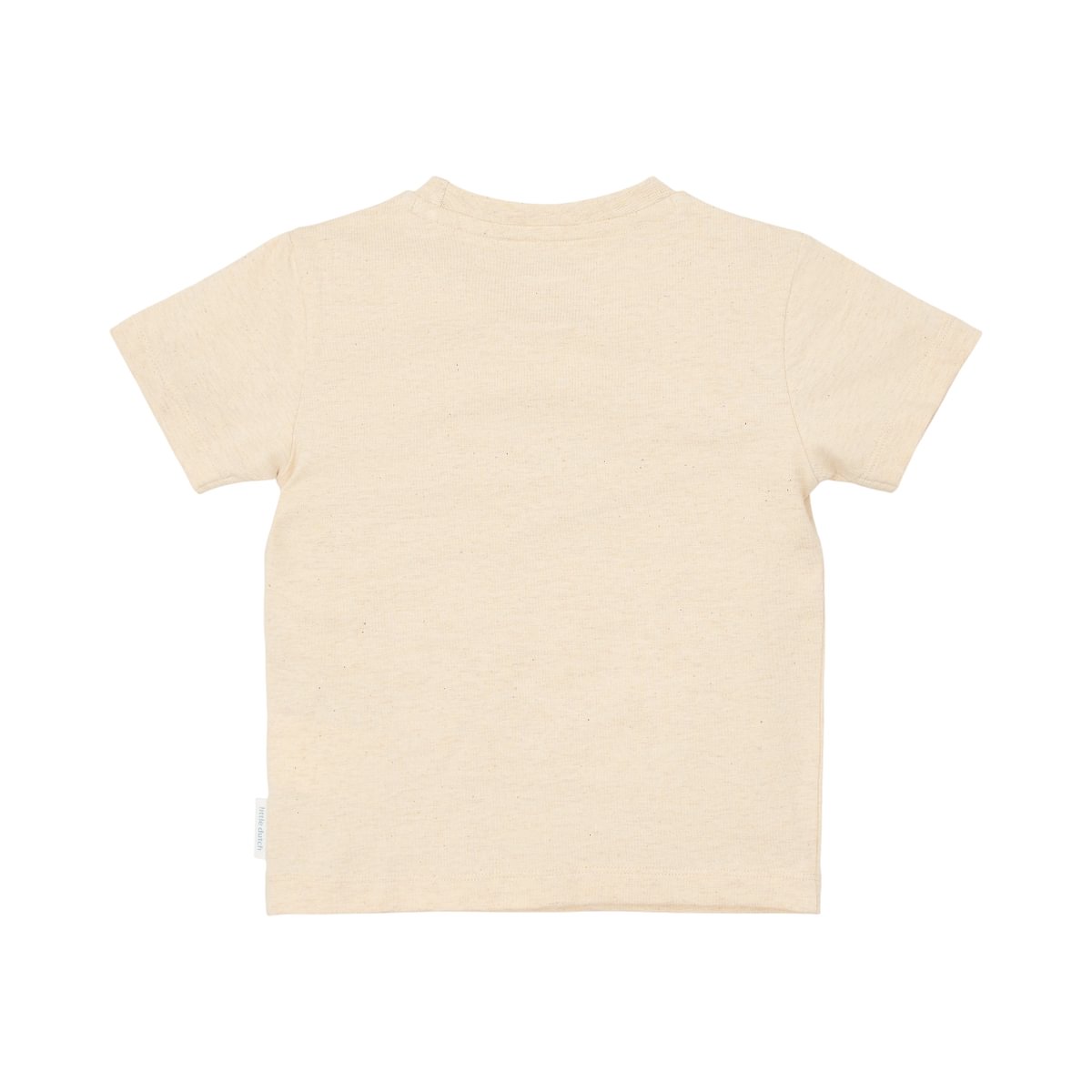 T-shirt met korte mouw in tricot in het beige-melee met een klein print ‘everything is cool’. Een drukknoopsluiting op de schouder. Stofsamenstelling biologisch katoen(95%) en elastaan(5%). Comfortabel en goed draag- en wasbaar. (OEKO TEX = Veiligheid Standard)