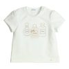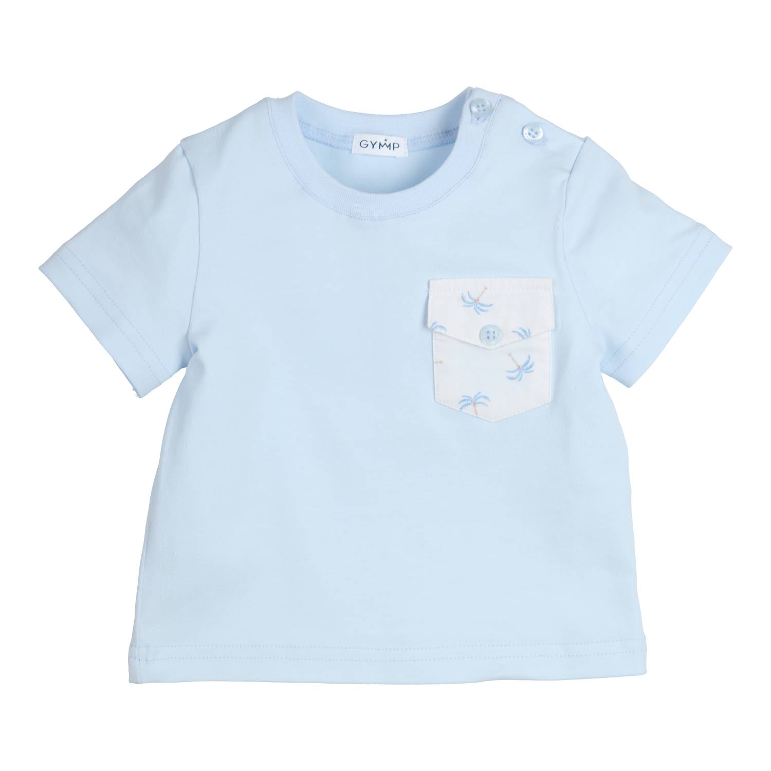 T-shirt met een kort mouwtje in het lichtblauw. Deze heeft een klein borstzakje met een palmprintje. Knoopsluiting op de linker schouder. Bijna volledig biologisch katoen(93%) en een klein beetje elastaan(7%). Comfortabel en goed wasbaar.