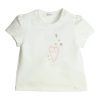 T-shirt met een kort pofmouwtje in het off-white. Deze heeft een multicolor opdruk met een hart en bloemetjes. Drukknoopsluiting op de linker schouder. Bijna volledig biologisch katoen(93%) en een klein beetje elastaan(7%). Comfortabel en goed wasbaar.