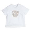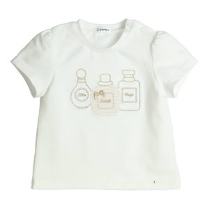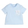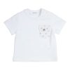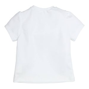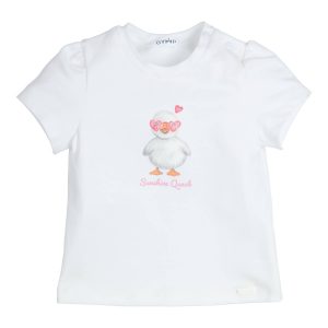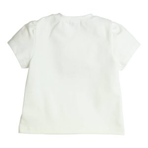 T-shirt met een kort mouwtje in het wit. Deze heeft een klein borstzakje met een printje. Knoopsluiting op de linker schouder. Bijna volledig biologisch katoen(93%) en een klein beetje elastaan(7%). Comfortabel en goed wasbaar.