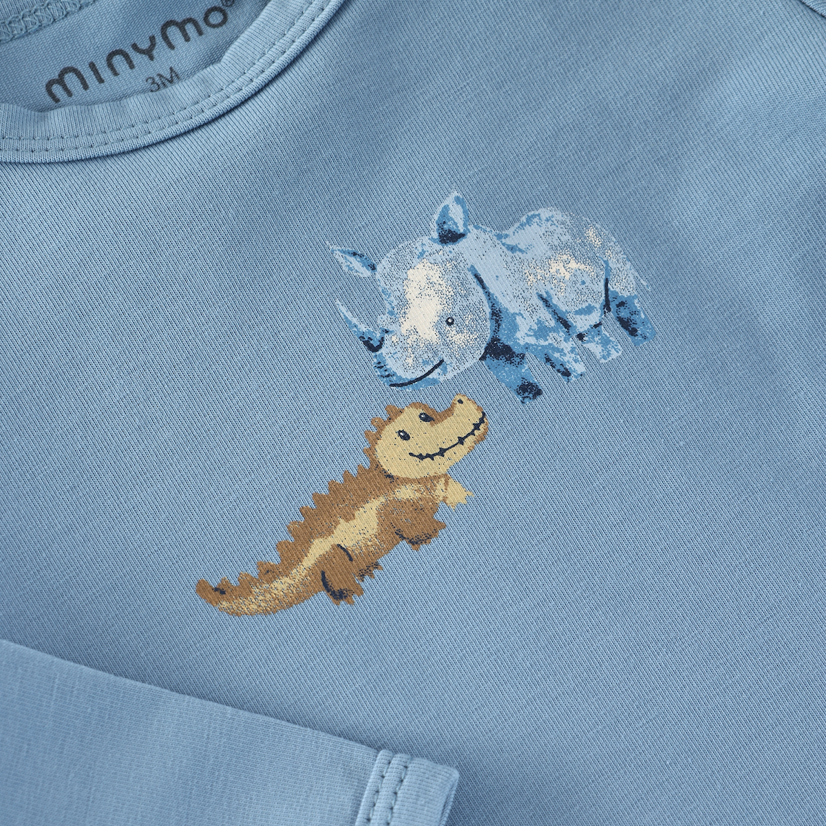 T-shirt lange mouw in het blauw met een print van ‘wilde dieren’. Drukknoopsluiting op de schouders en is gemaakt van GOTS-katoen(95%) en elastaan(5%). Comfortabel en goed draag- en wasbaar. (GOTS = Global Organic Textile Standard)