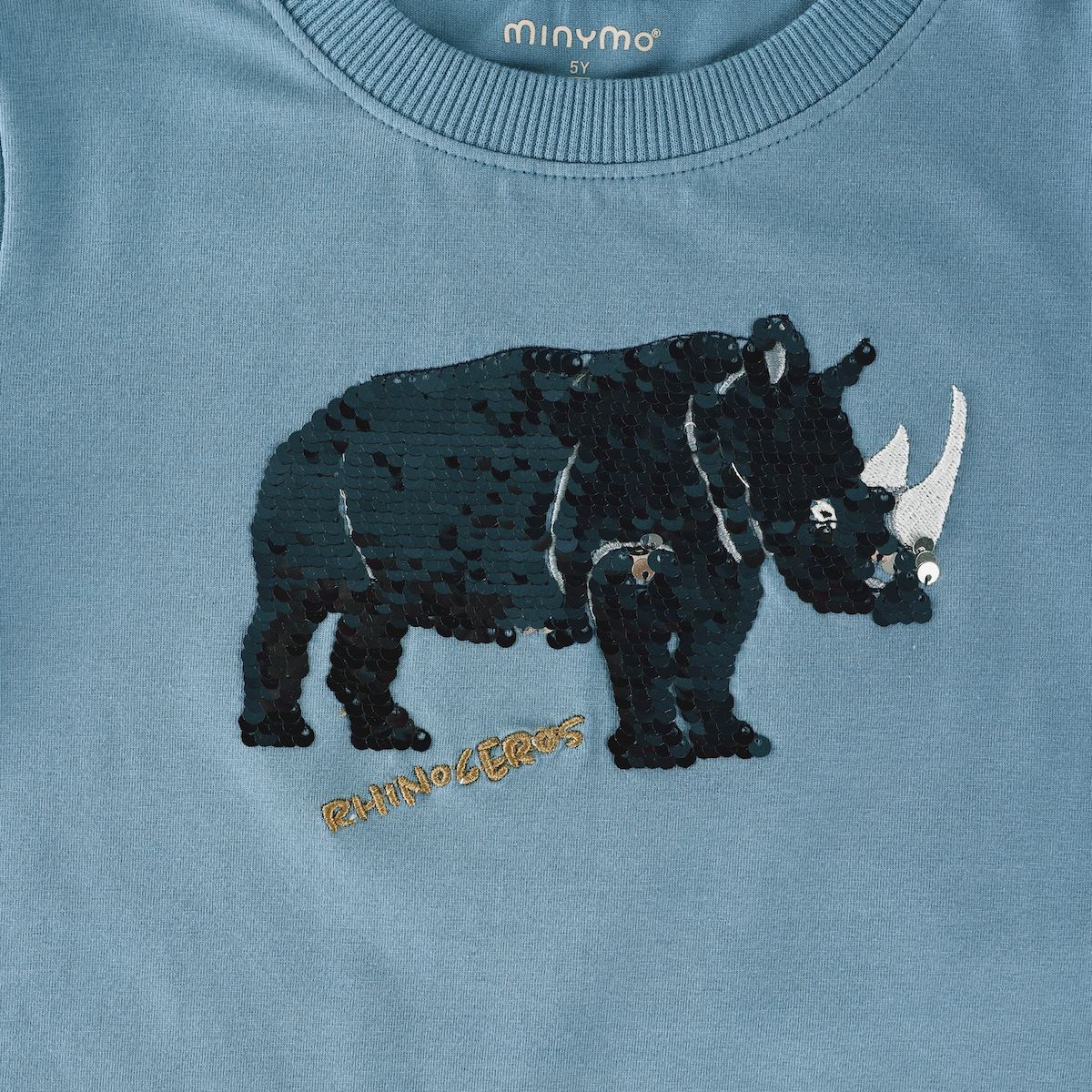 T-shirt korte mouw in het blauw met een afbeelding van een neushoorn van draaibare pailletten. Stofsamenstelling katoen(95%) en elastaan(5%). Comfortabel en goed draag- en wasbaar.